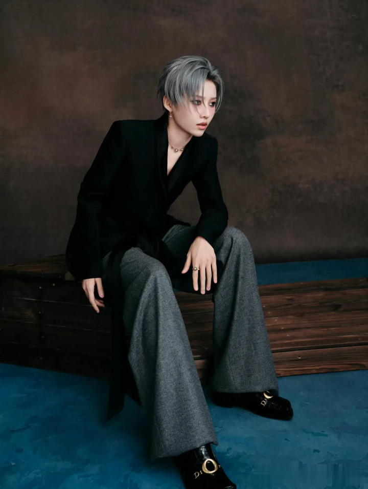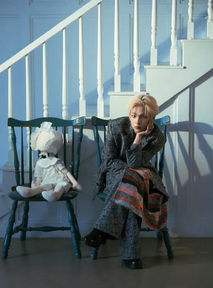 周震南一头金发,坐在板凳上托腮看向镜头,旁边还放了一个娃娃,仿佛在拍摄时尚画报,他这个服装也蛮适合她的。