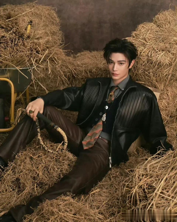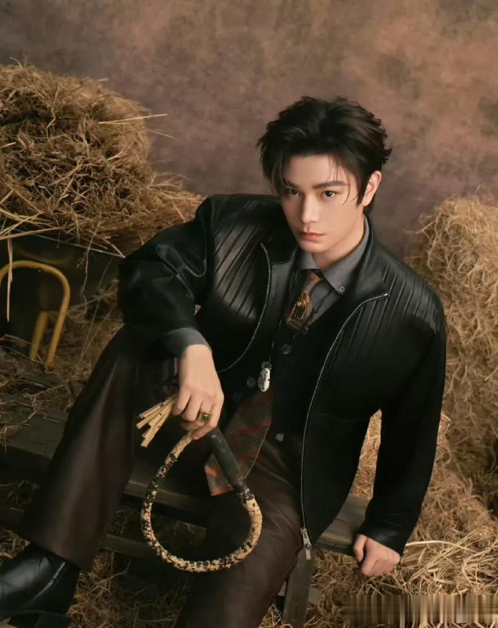 丁禹兮这拍摄的场地像是在牛棚里,手里还拿着鞭子,有点牛仔风,穿着黑色皮衣搭配褐色西裤,完全是成熟男性。
