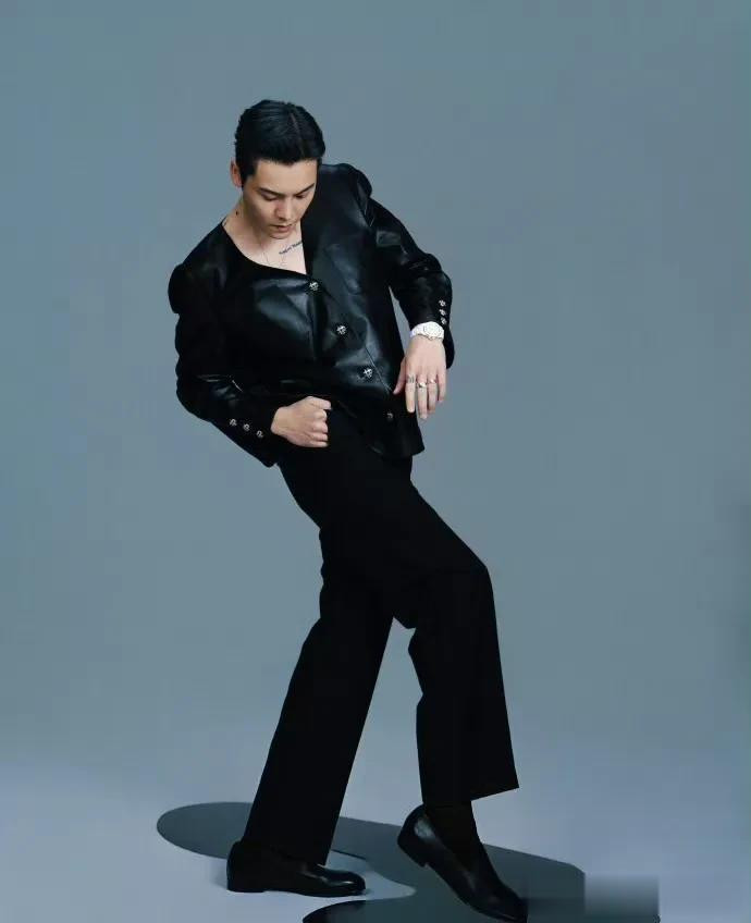 陈伟霆这个动作让人有点看不懂,哈哈,不过他的身材倒是让人很斯哈,直接真空穿皮衣外套,大秀身材,肌肉线条也很完美。