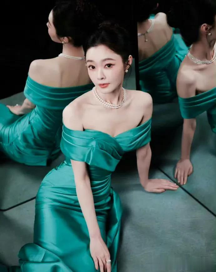 宋轶一身湖绿色的一字肩长裙,搭配丸子头和珍珠项链,整体比较优雅知性,但造型上没什么亮眼,和以往风格差不多。