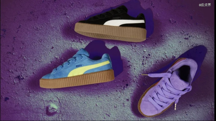 彪马的崛起堪称传奇。起源于一个德国小镇家庭,当时达斯勒家族的兄弟二人共同生产专业运动鞋。后来,哥哥创办彪马,弟弟则做出了阿迪达斯。外界印象深刻的是,彪马曾凭借与明星蕾哈娜合作设计的Creeper运动鞋风靡全球,巅峰时期一年营收84.65亿欧元(约合人民币720亿元)。