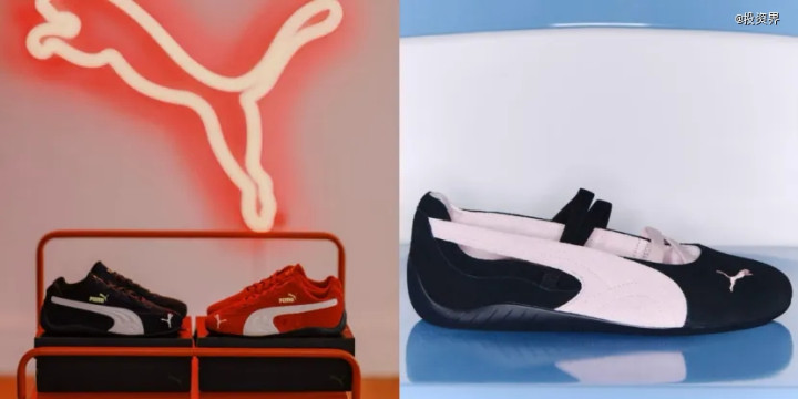 还有另一款芭蕾鞋(SpeedcatBallet),外形堪称“奇妙混合体”,既有赛车鞋标志性的超薄鞋底和紧贴脚面的流线轮廓,但又被改造成了芭蕾平底鞋的形态没有鞋带,一脚蹬入,脚背上还横着四根松紧带。由于造型奇特,与YEEZY洞洞鞋(FoamRunner)、KEEN登山鞋(JASPER)等一起被评为丑鞋代表,却意外受到中产群体的追捧。